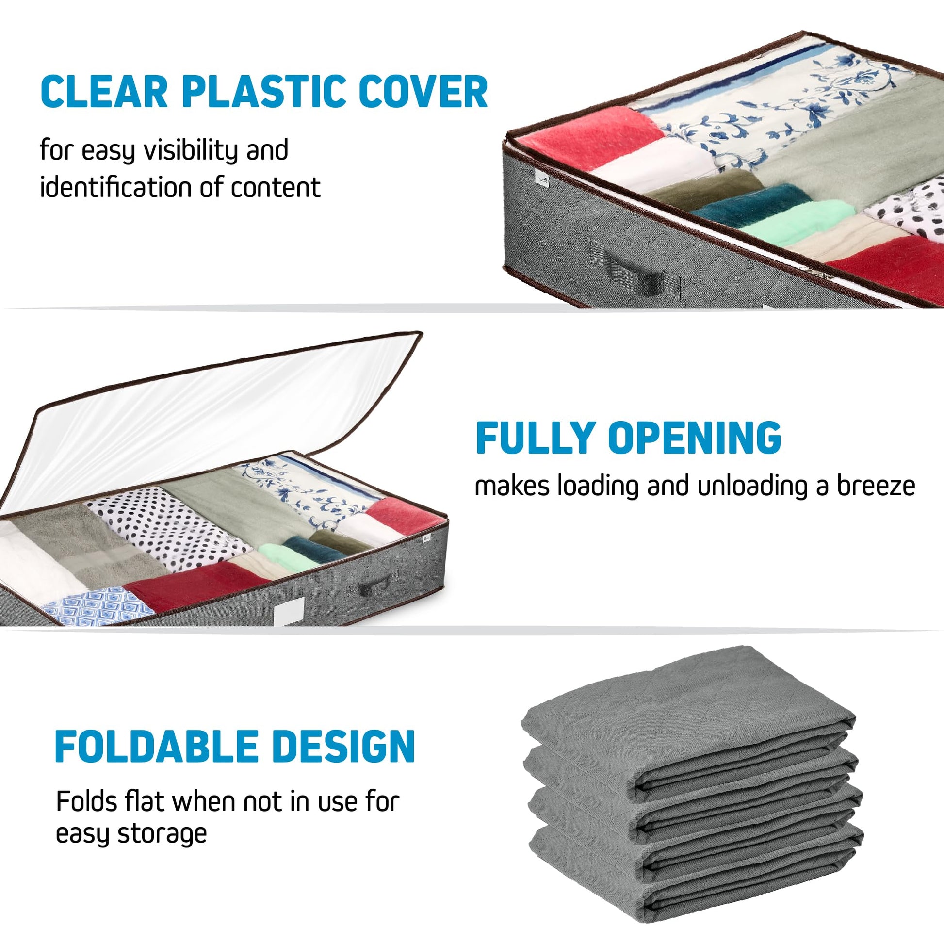 Under Bed Storage Bins - Pack Of 4 Under The Bed Storage Containers For Clothes, Blankets, Winter Clothing, & Shoes - Underbed Storage Containers With Handles, Dual Zippers, & Clear Top