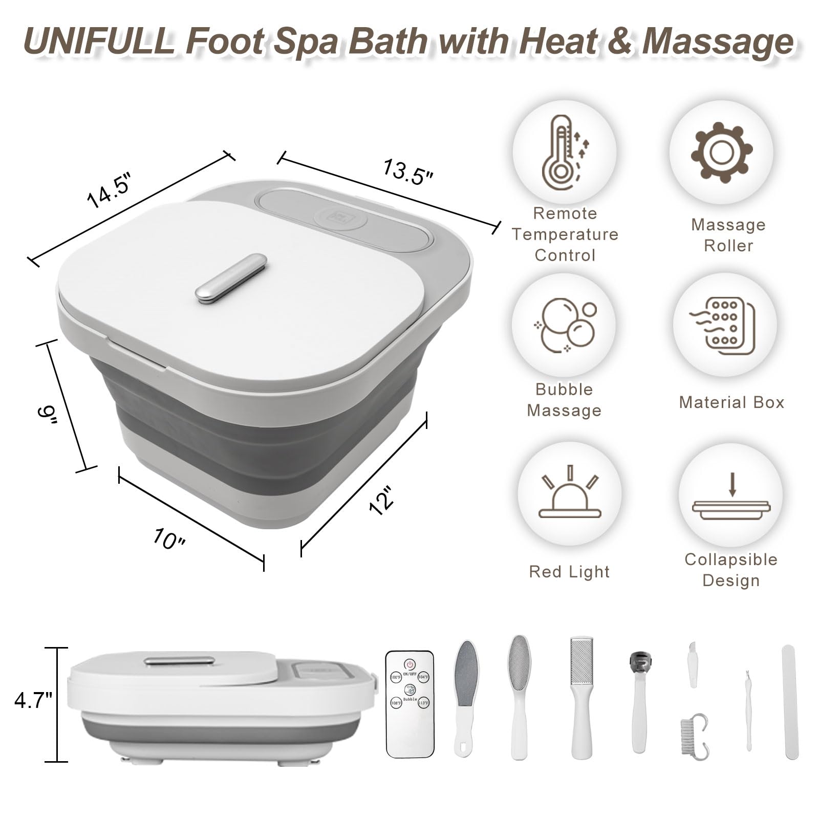 UNIFULL Collapsible Foot Spa Bath with Heat and Massage Rollers, Bubble, Foot Pedicure Kit, Temperature Control, Red Light, Pedicure Foot Spa, Foot Bath