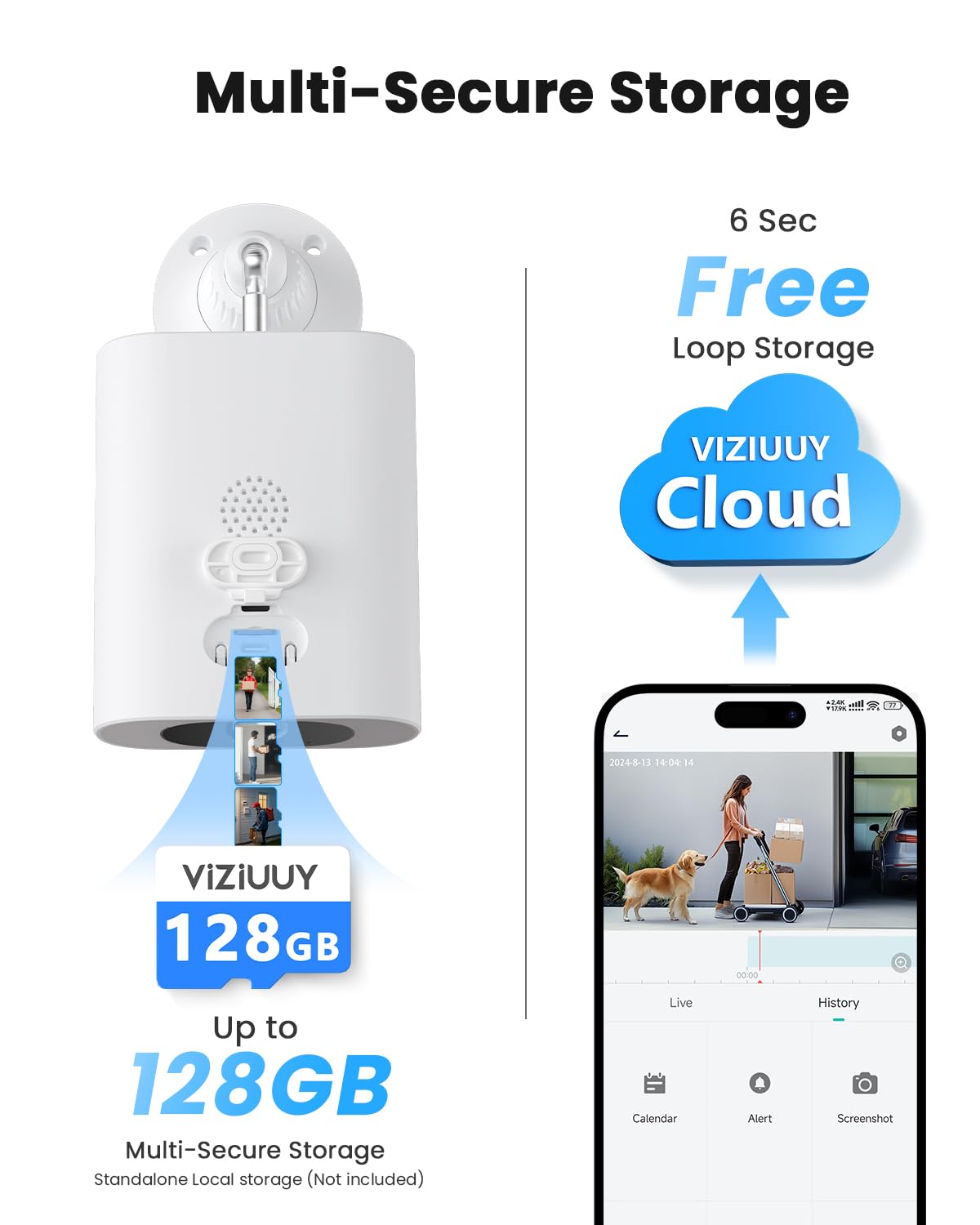 • [2-Way Audio & IP65 Weatherproof] VIZIUUY home security cameras have a built-in microphone and speaker that supports smooth live two-way audio. With the App you can warn off thieves, screen visitors at your door or communicate directly with your family or friends. IP65 weatherproof rated camera is designed specially for outdoors, handles easily in all kinds of extreme weather,whether it rains or snows
