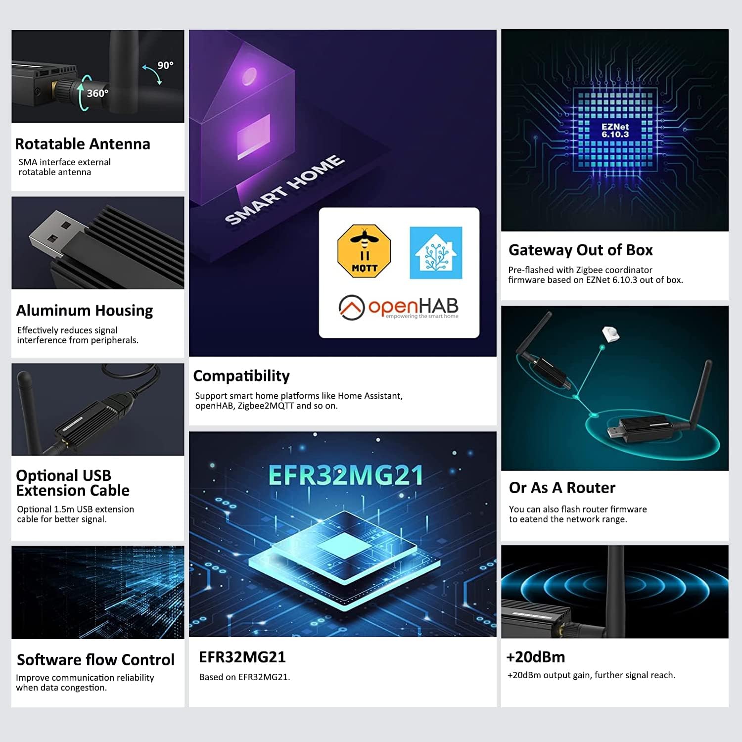 • Pre-flashed Z-Stack 3.x, 0 coordinator firmware, zigbee can use ZHA in Home Assistant or use Zigbee2MQTT,based on TI EFR32MG21 + CH9102F,+20dBm output gain.